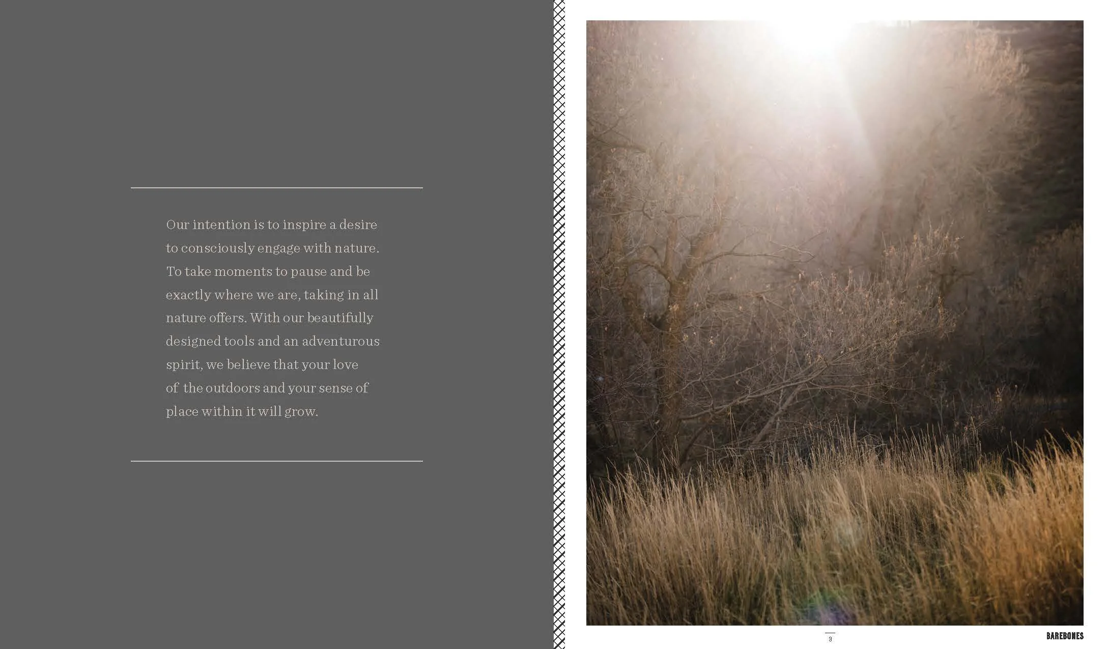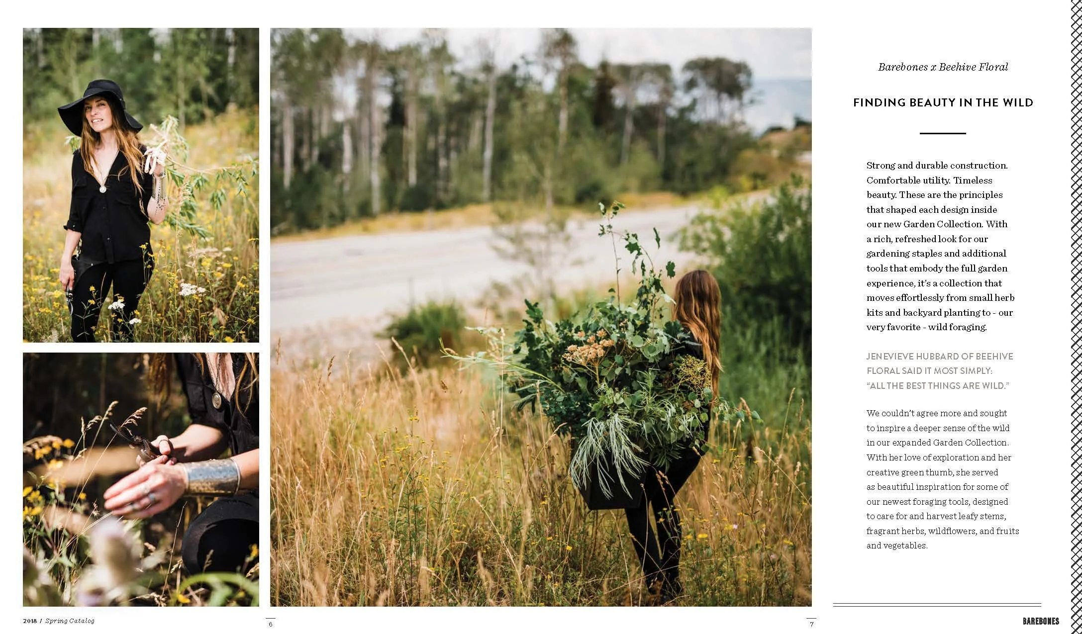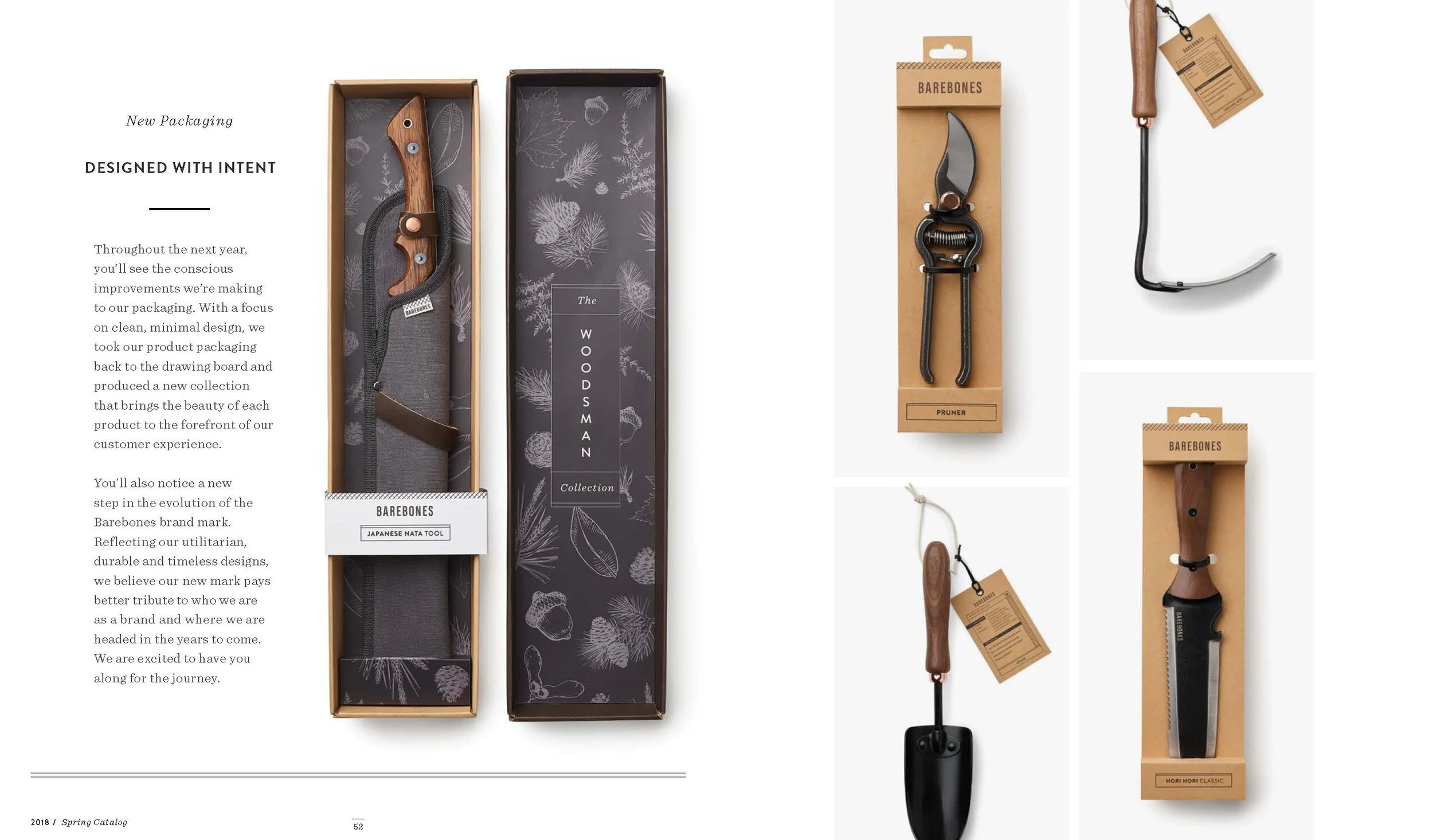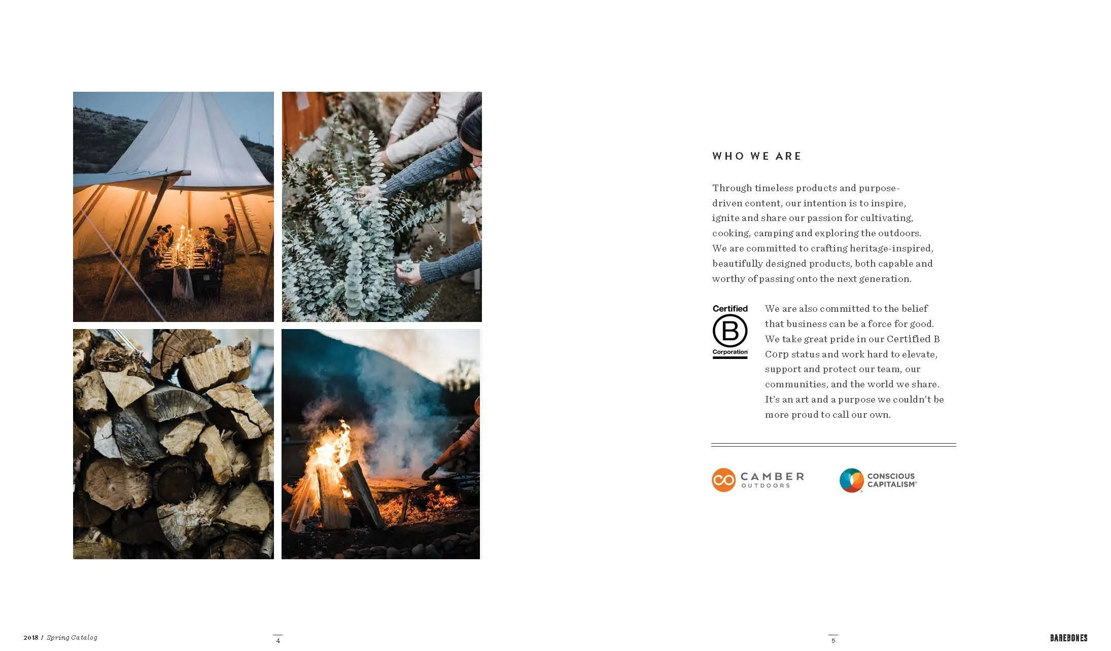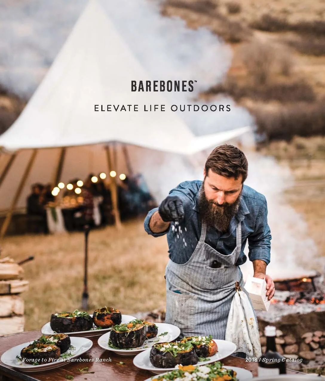 Layout and design of Barebones Spring 2018 catalog, featuring over 30 products across 60 pages. Barebone's intention is to inspire a desire to consciously engage with nature. This catalog is a unique blend of stories and lifestyle images to showcase the Barebones experience that their products provide.