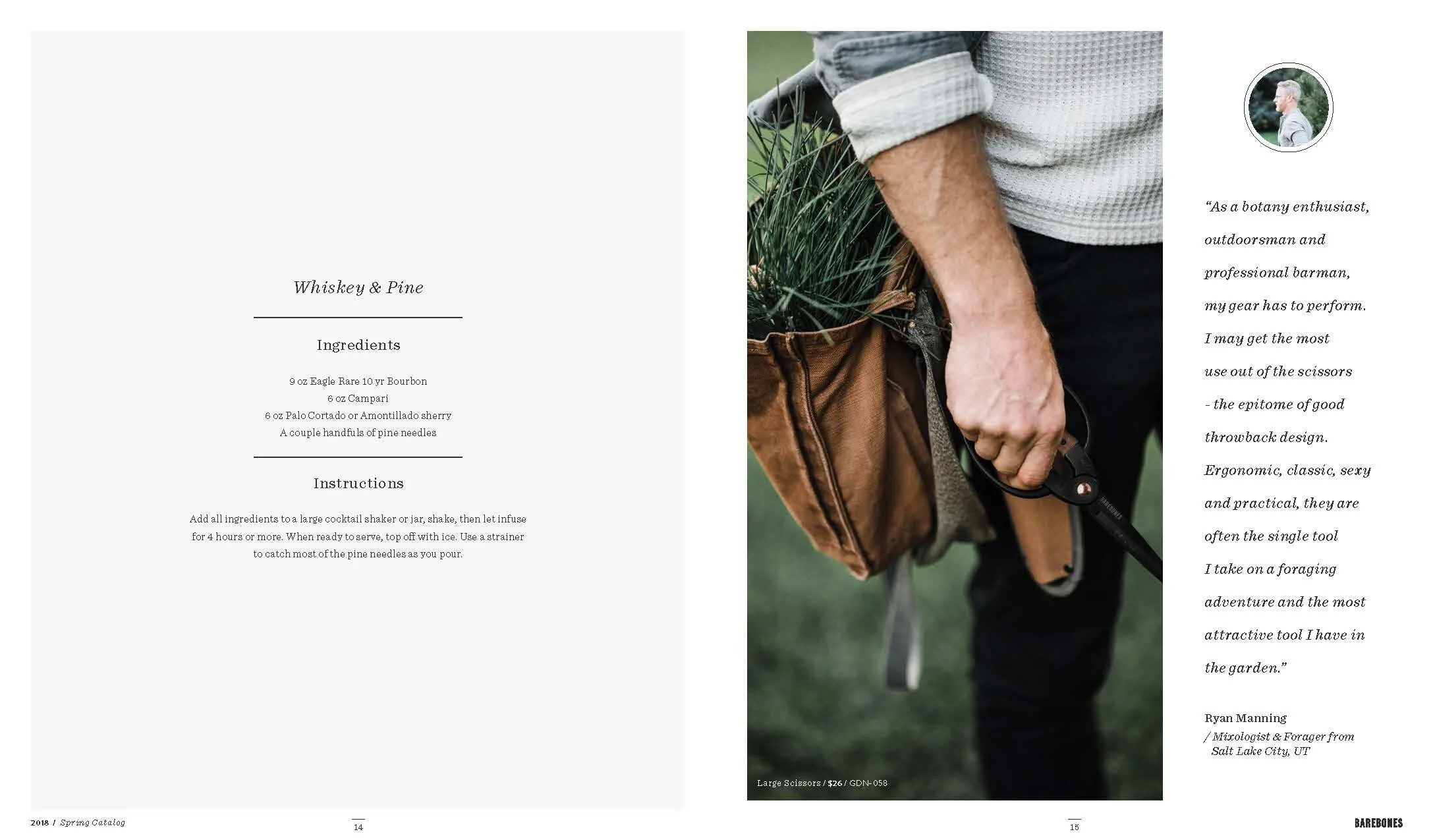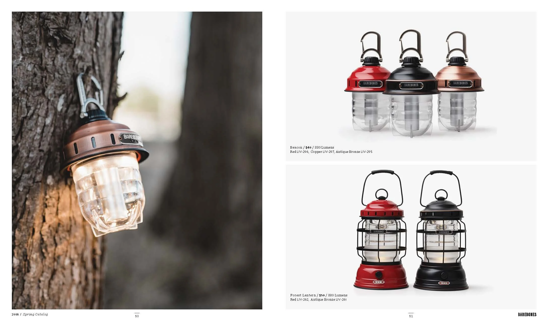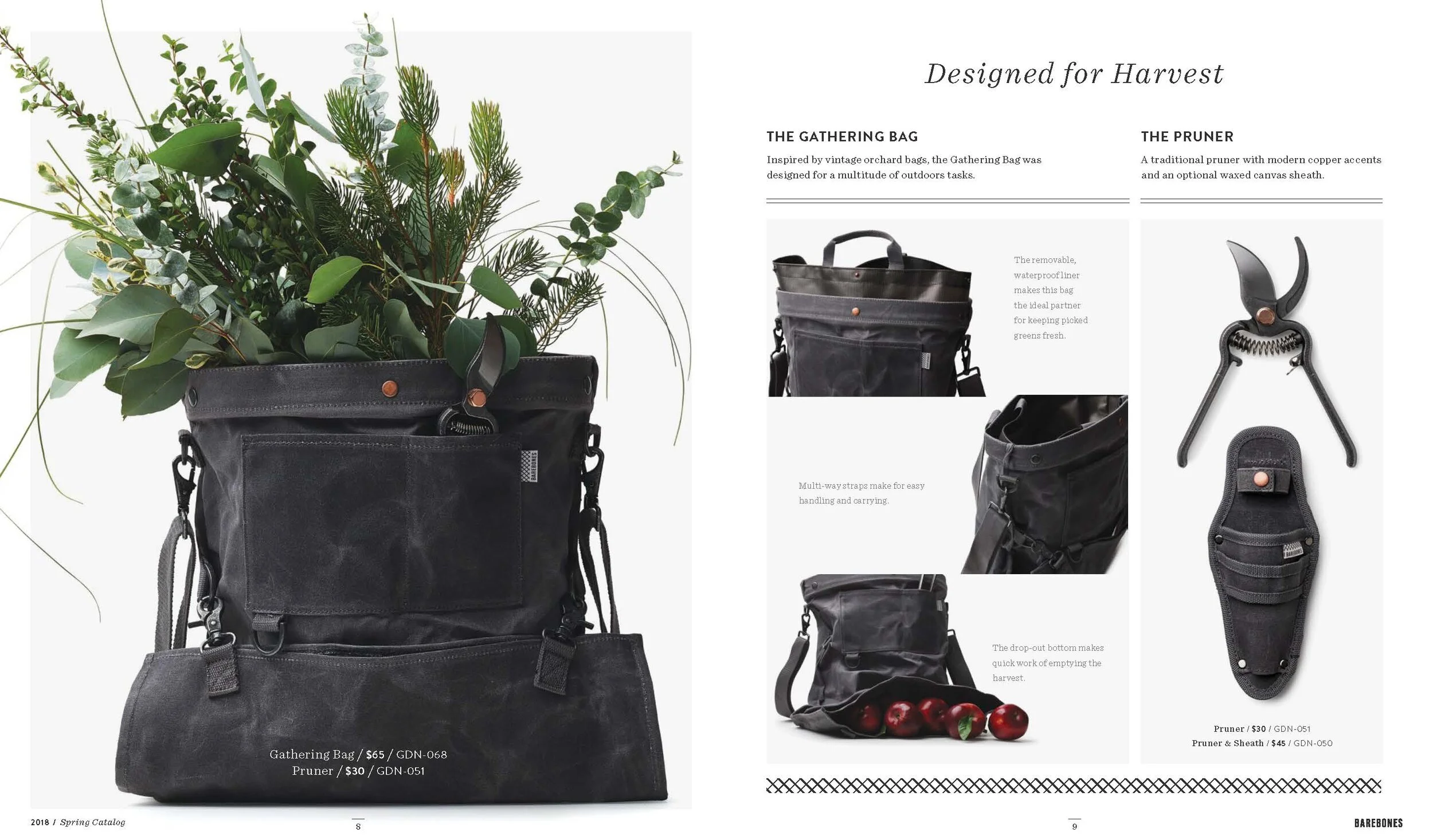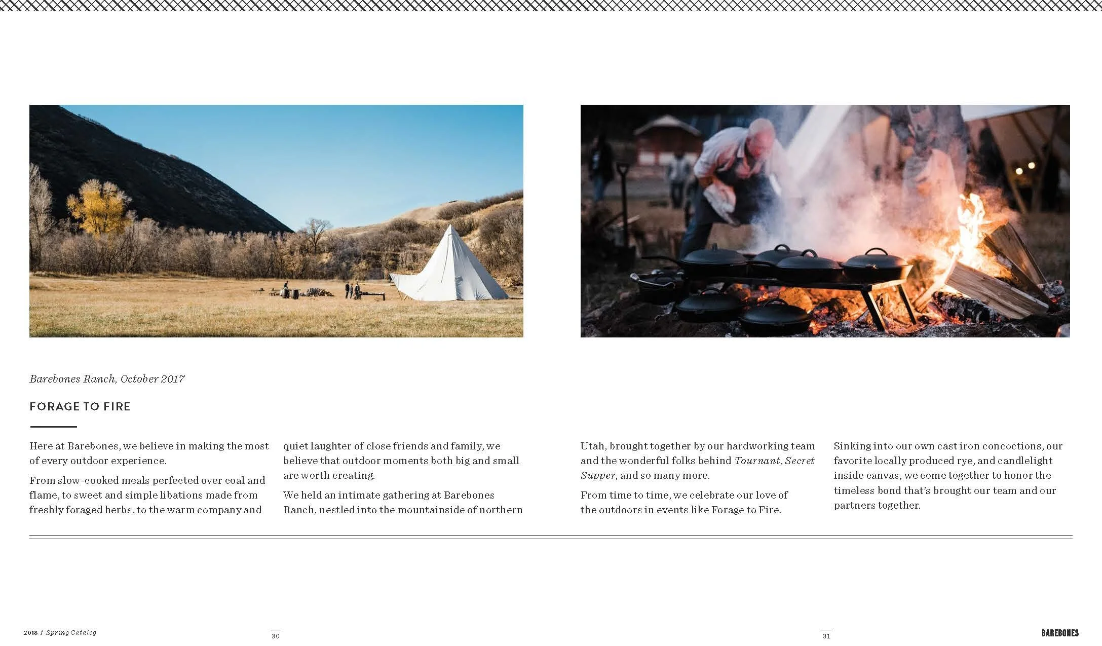 Layout and design of Barebones Spring 2018 catalog, featuring over 30 products across 60 pages. Barebone's intention is to inspire a desire to consciously engage with nature. This catalog is a unique blend of stories and lifestyle images to showcase the Barebones experience that their products provide.