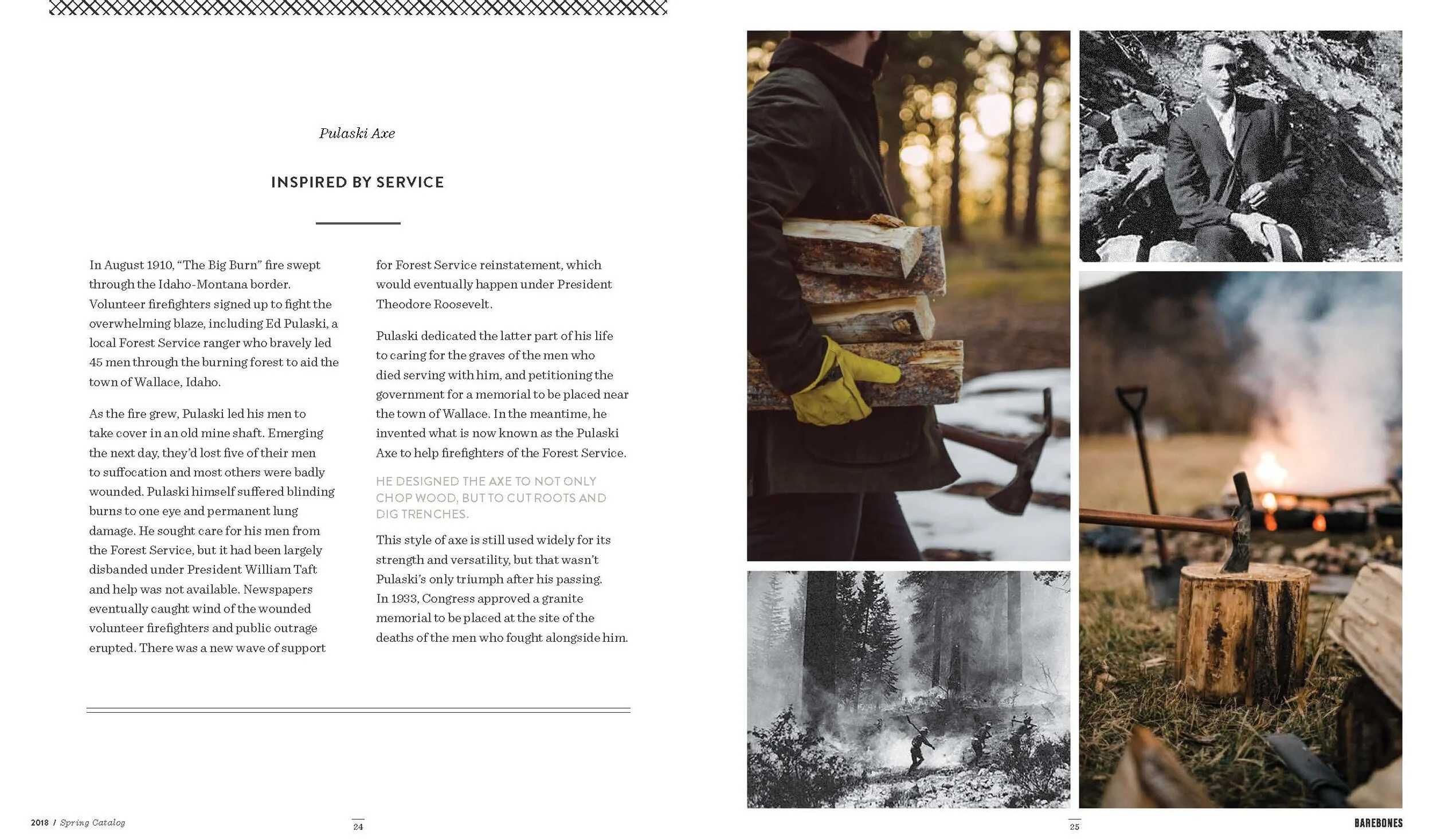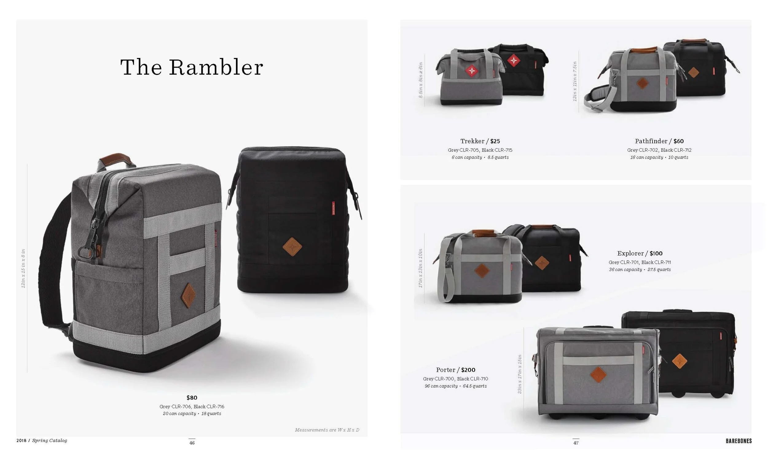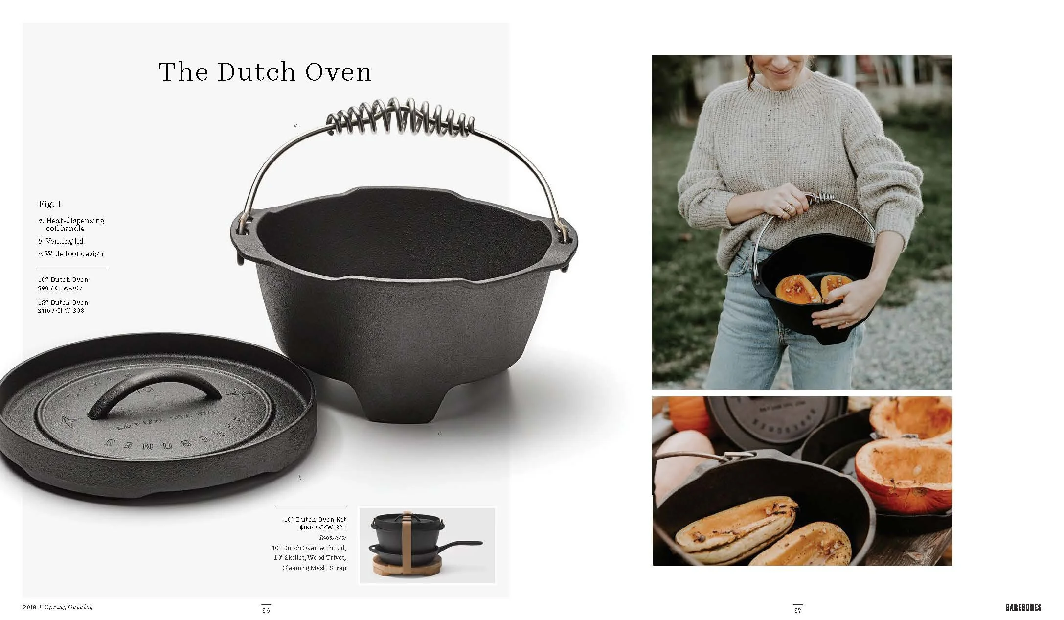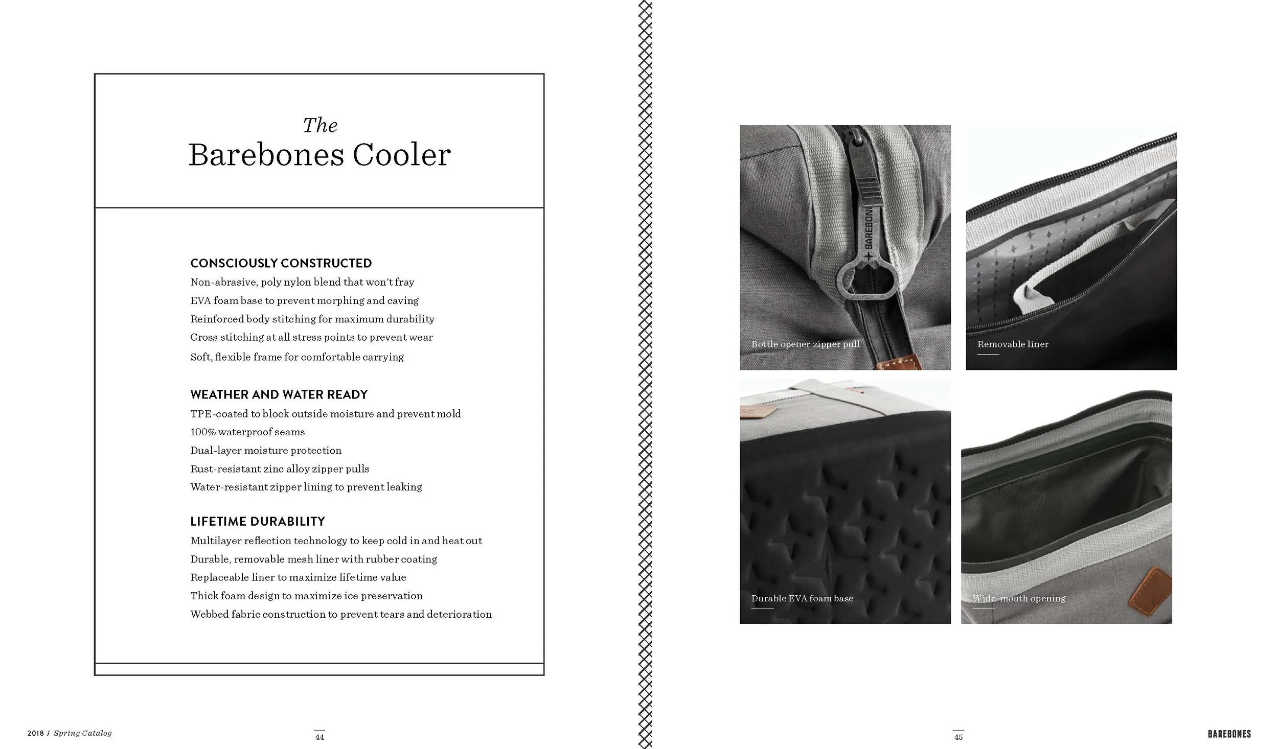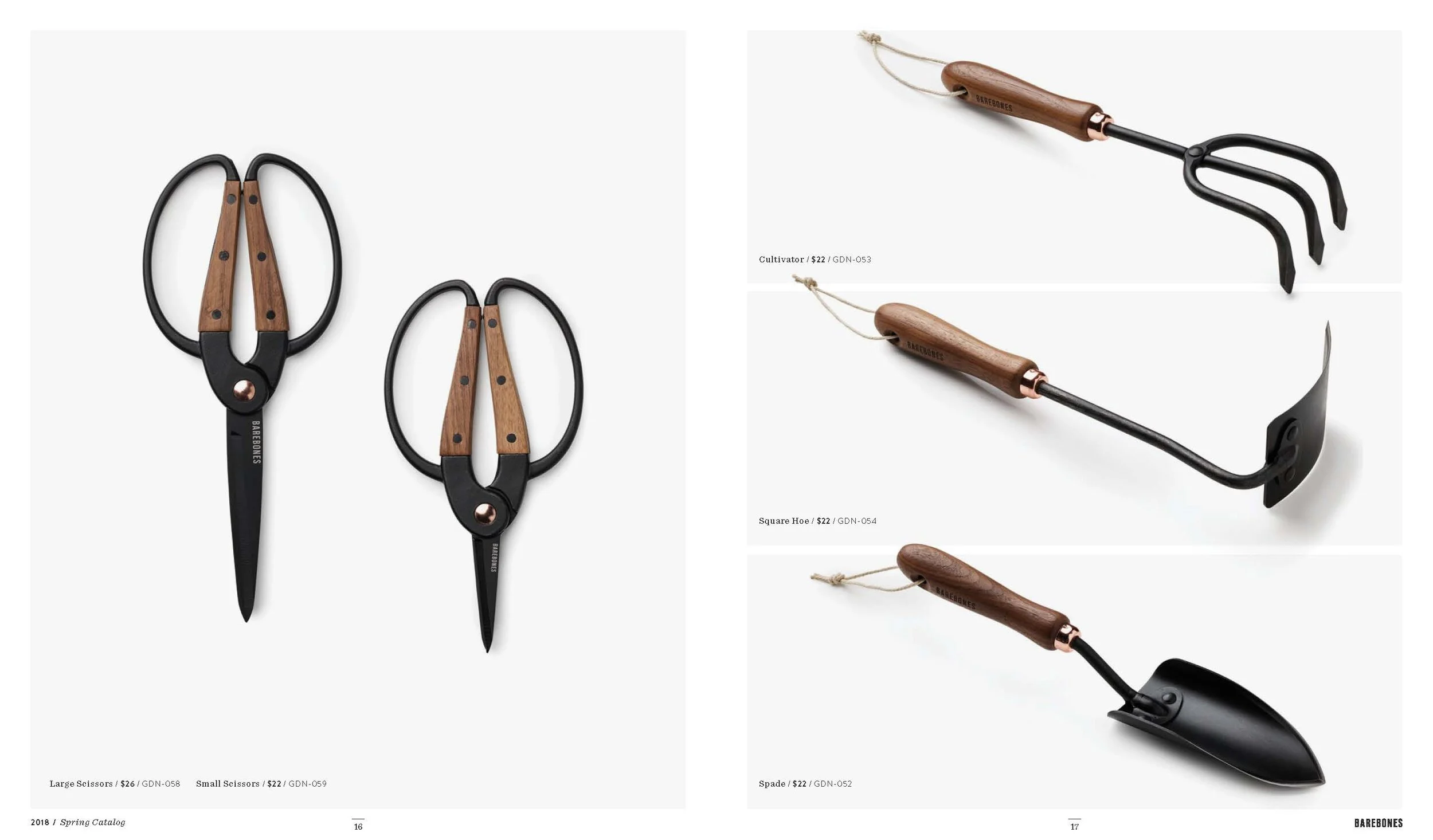 Layout and design of Barebones Spring 2018 catalog, featuring over 30 products across 60 pages. Barebone's intention is to inspire a desire to consciously engage with nature. This catalog is a unique blend of stories and lifestyle images to showcase the Barebones experience that their products provide.