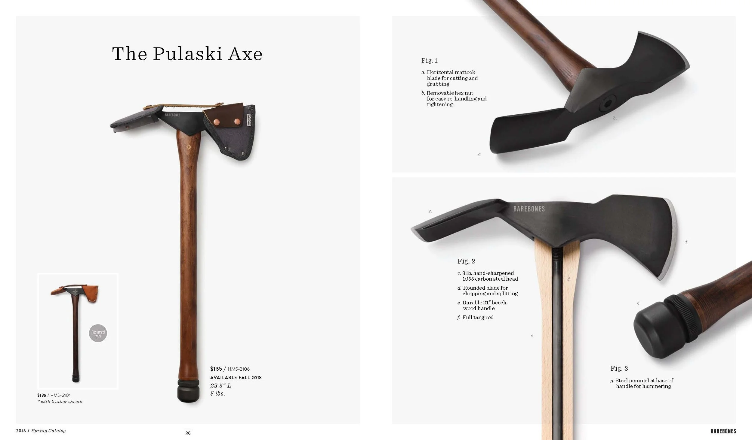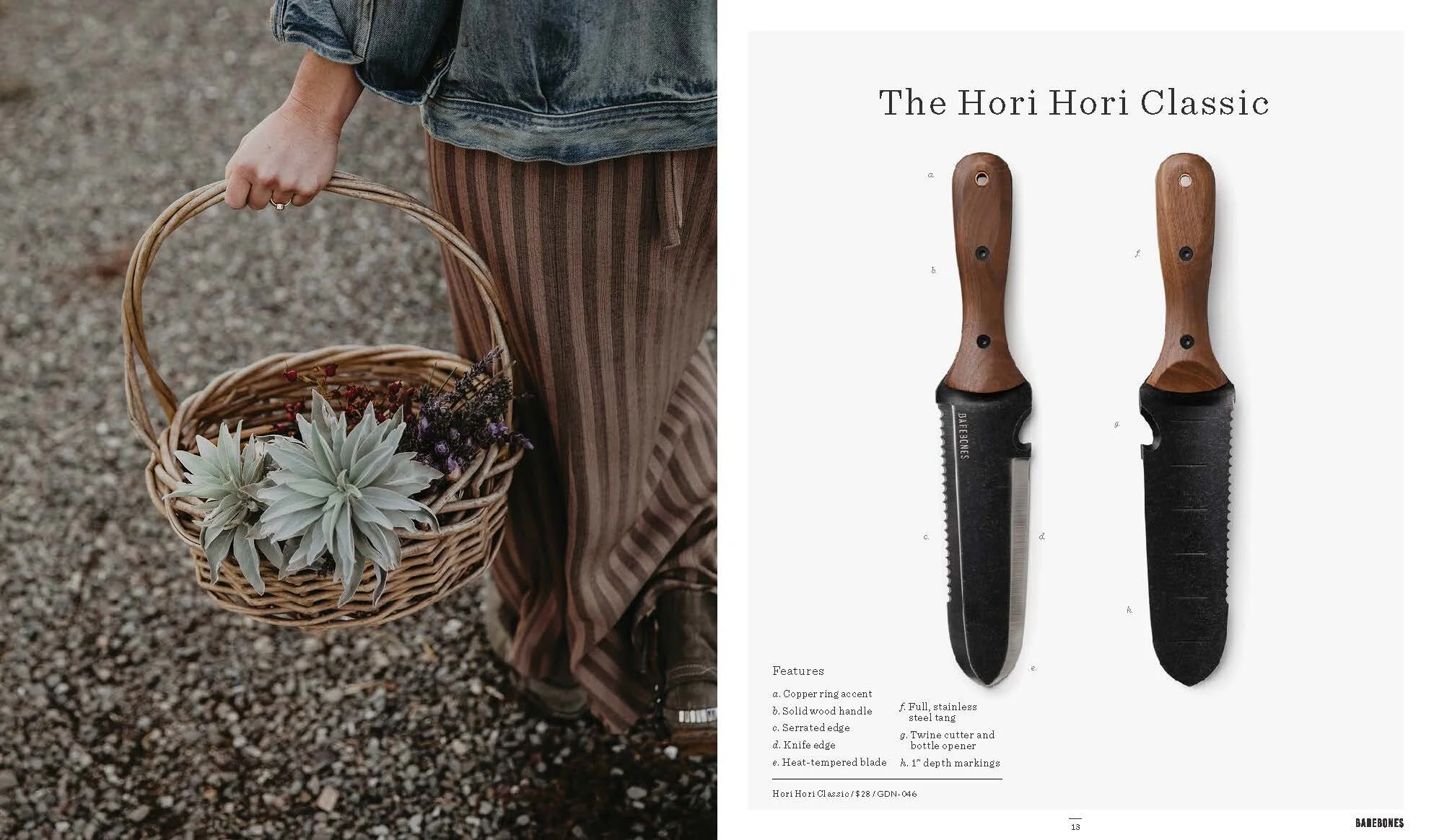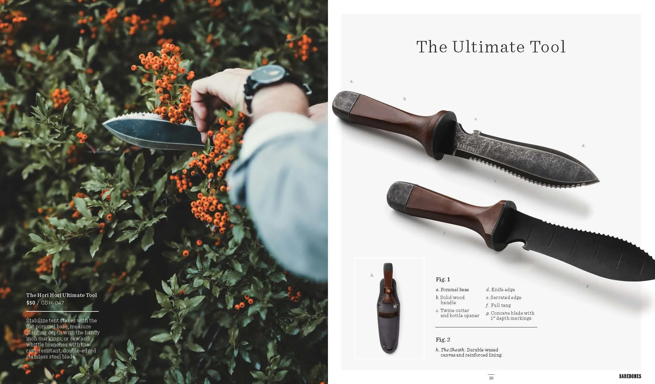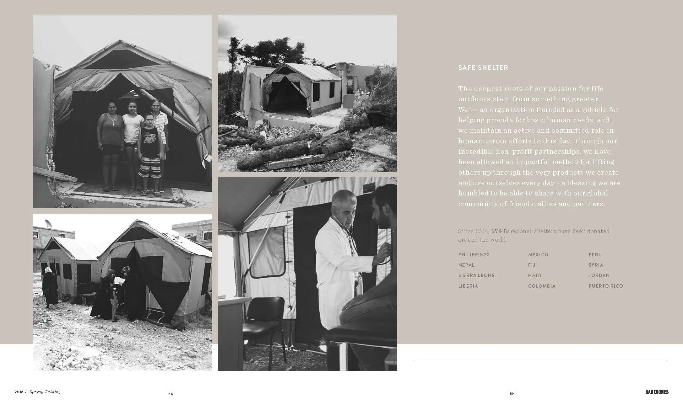 Layout and design of Barebones Spring 2018 catalog, featuring over 30 products across 60 pages. Barebone's intention is to inspire a desire to consciously engage with nature. This catalog is a unique blend of stories and lifestyle images to showcase the Barebones experience that their products provide.
