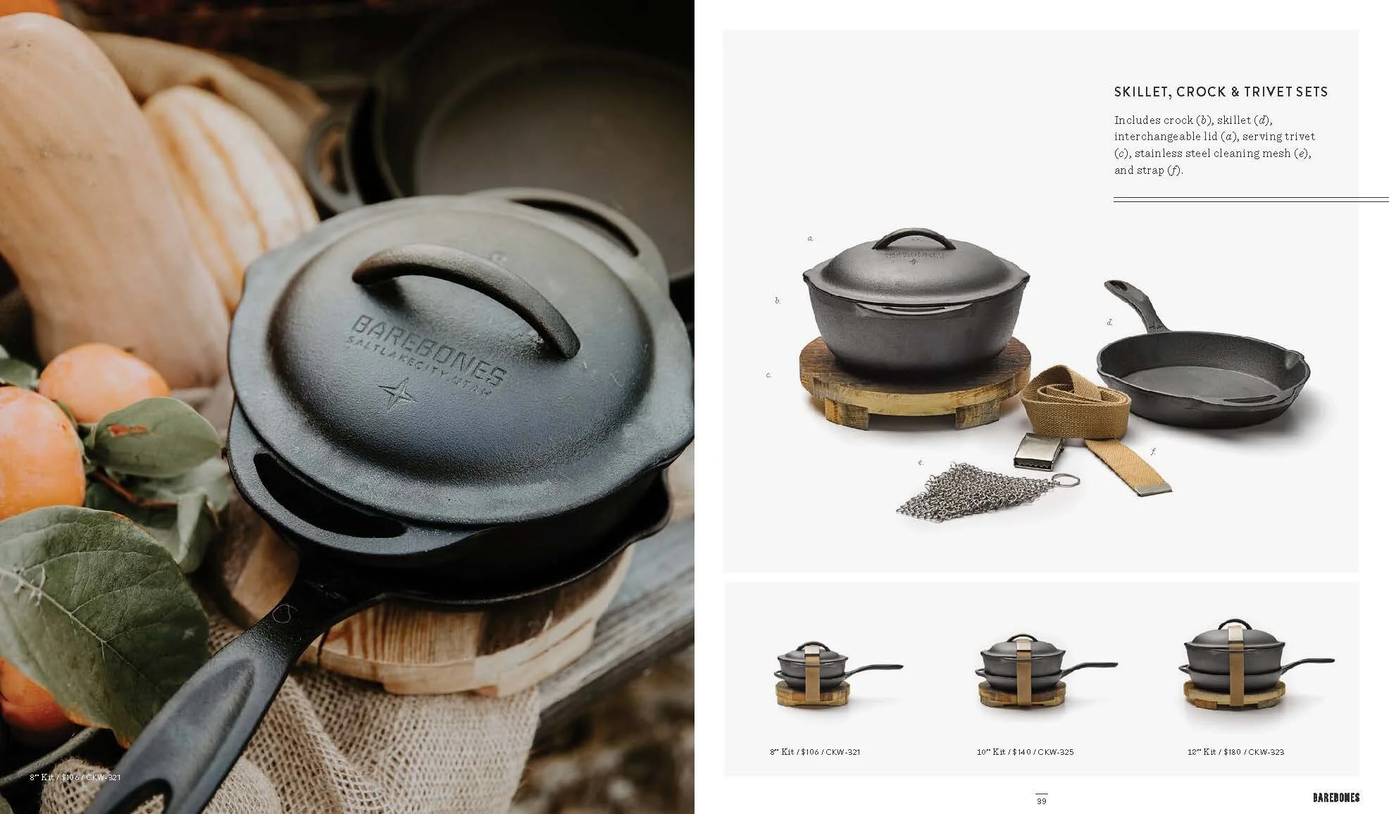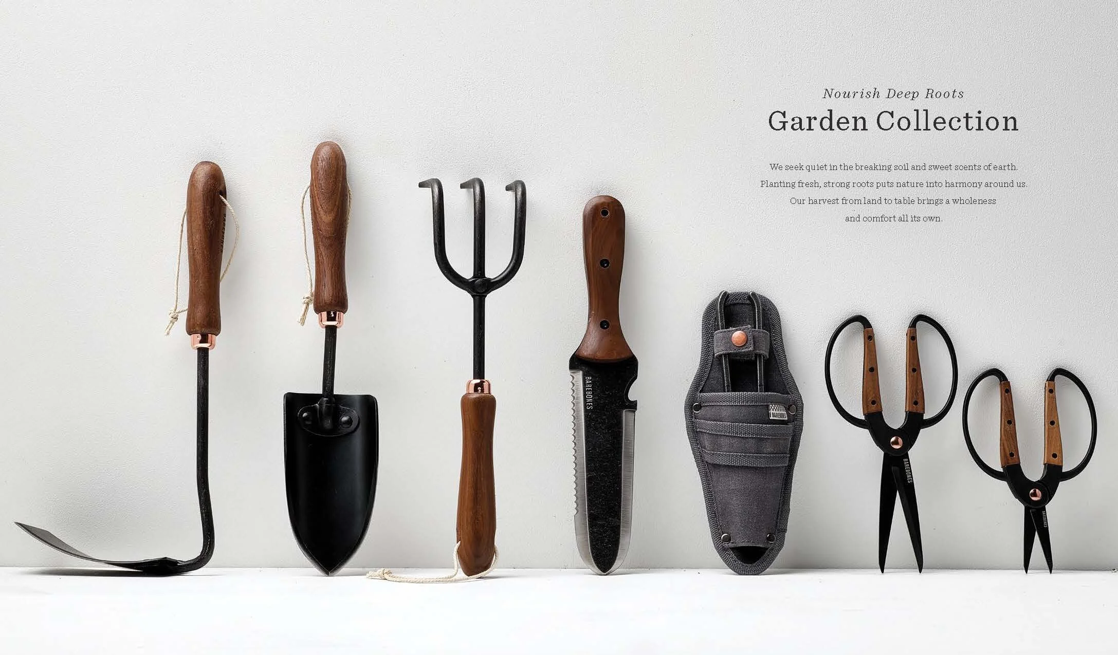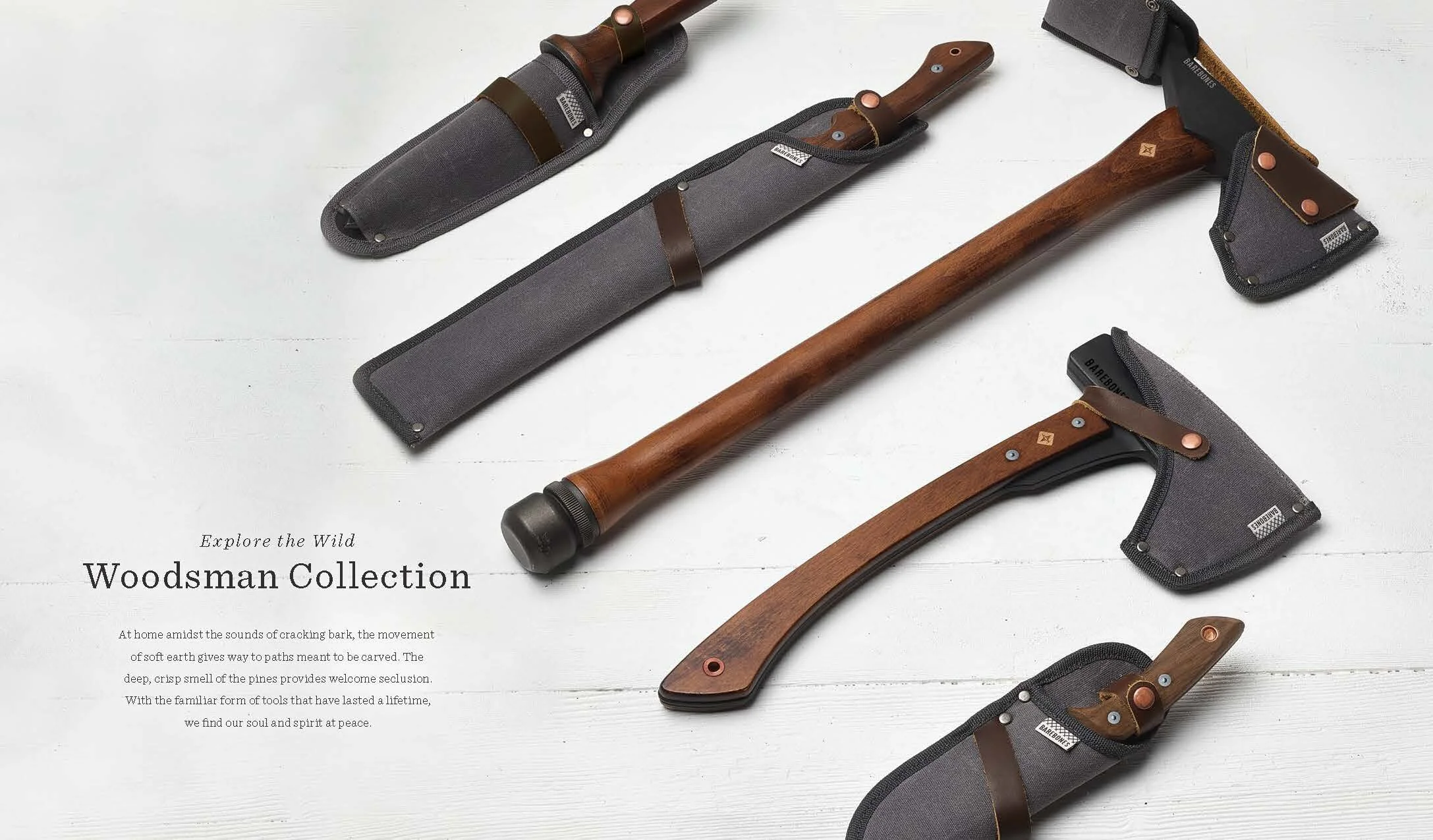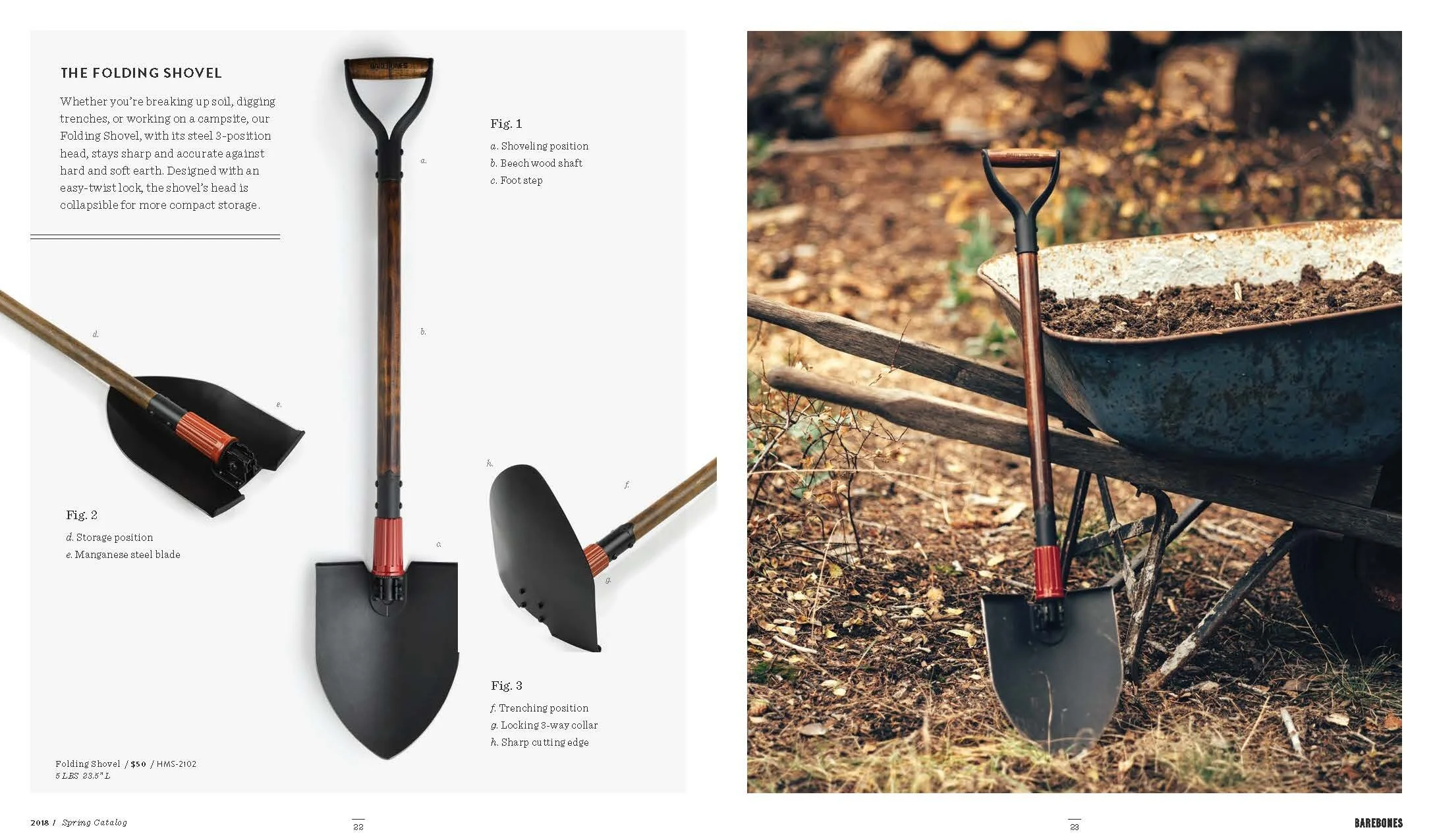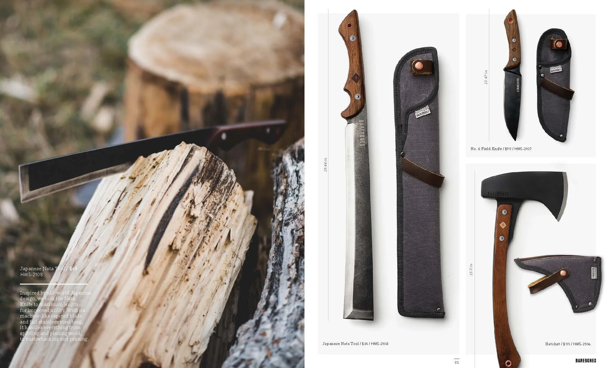 Layout and design of Barebones Spring 2018 catalog, featuring over 30 products across 60 pages. Barebone's intention is to inspire a desire to consciously engage with nature. This catalog is a unique blend of stories and lifestyle images to showcase the Barebones experience that their products provide.